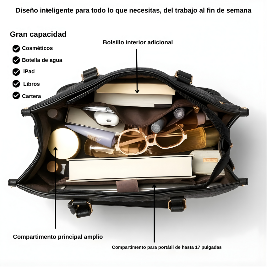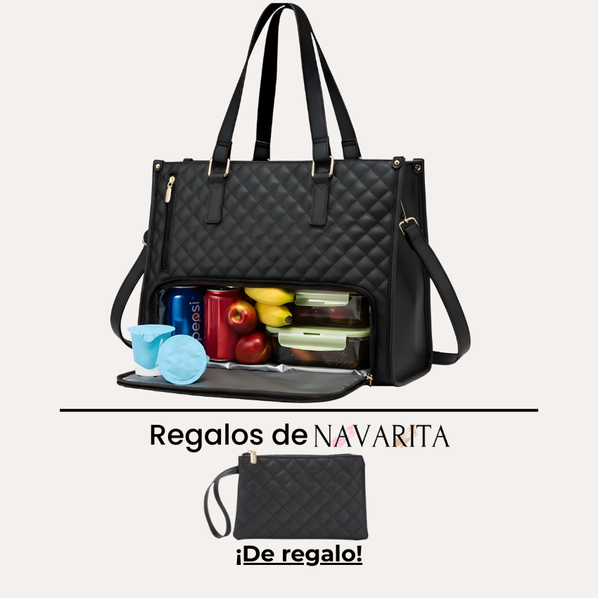 El Bolso Tote Navia 2 en 1 está diseñado para mujeres que quieren orden, estilo y practicidad en un solo bolso. Combina bolso diario, bolso para portátil y compartimento térmico oculto sin perder elegancia.